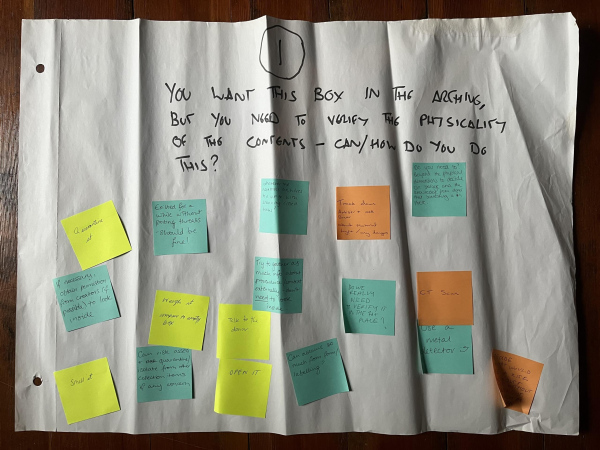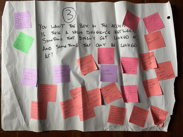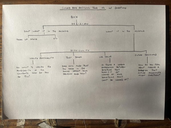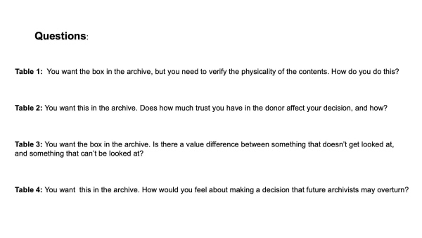 Student workshop looking at the difficulties and possibilities of accessioning unknown, secret material into an archive.